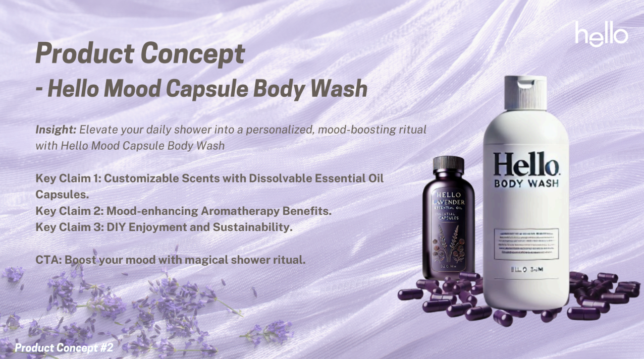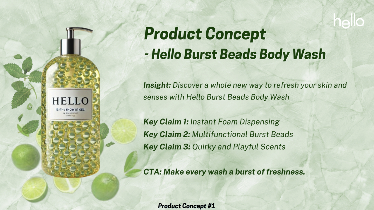 Developed a sensorially engaging body wash concept for Hello by translating brand equity into a new product line through consumer insight, emotional positioning, and strategic product innovation.